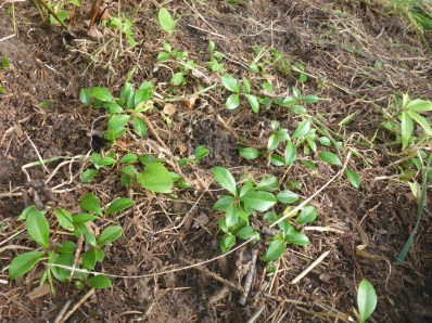And this is wintergreen (Gaultheria procumbens), and yes, the leaves taste like Lifesavers. I planted a little 3″ pot of this 2 years ago, then couldn’t find it ever again, probably due to weedy grasses that grew in that area. When I cleared out the grasses last week, lo and behold, the wintergreen had not only survived, but spread out – hooray!
