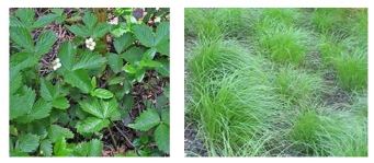 Along the walkway and to the left of the building is Wild Strawberry (Fragaria virginiana). This three-leafed plant sends out runners to effectively cover the soil.There are white flowers in May, and if you get there before the critters, small flavorful alpine strawberries in June and July. The plant recovers quickly if it is walked on.