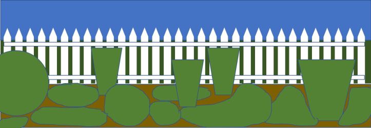 I don’t remember what they have planted here, other than the blue hydrangeas and a couple of small shrubs. But for the purpose of the exercise, I am going to pretend I’m starting with a clean slate, just a white picket fence about 3’ tall with a brick walk on the right (as seen from the house) and a cleared garden bed 3-4’ deep and maybe 24’ long, and in full sun. Something like this, which I drew in PowerPoint: