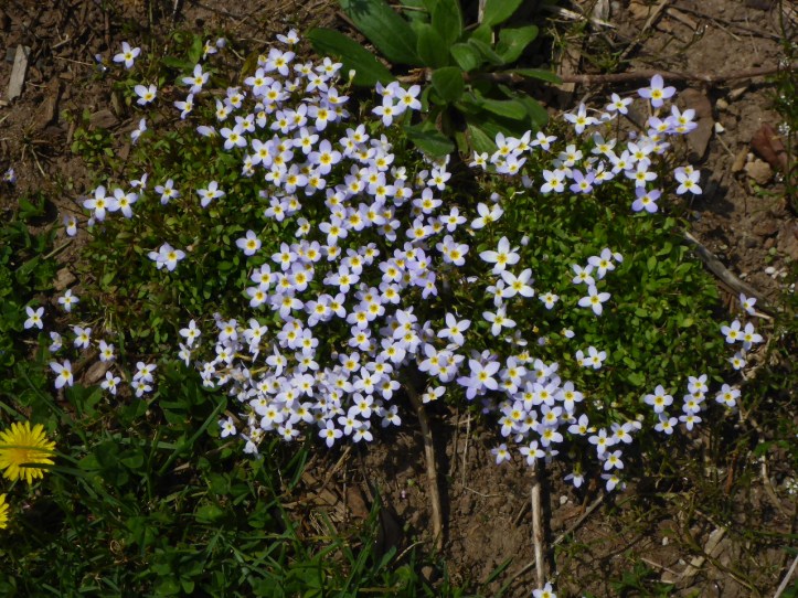 These bluets are wonderful tiny plants that I grow on the edge of a border. The clumps slowly expand and merge together to form a nice restrained ground cover. The flowers, with their yellow centers, bloom right after the daffodils, when it’s a quiet time in the garden, so they are all the more welcome.