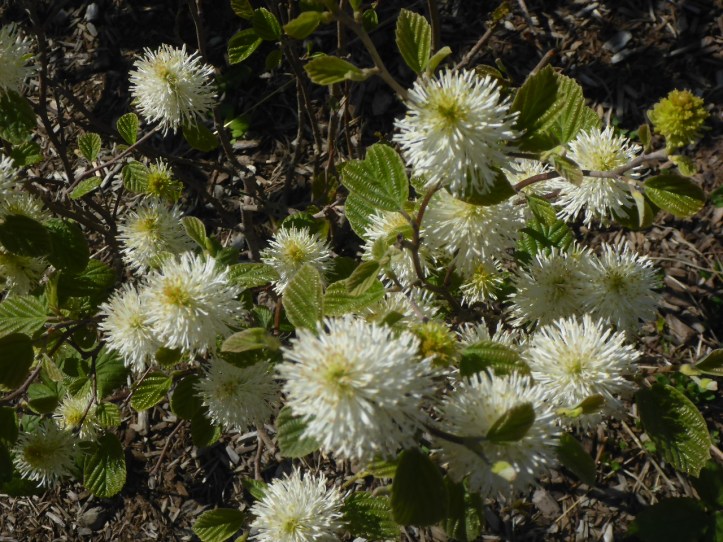 This is the bloom of the shrub fothergilla (Fothergilla ‘Mt. Airy’) in mid-May. The shrub itself is about 4’ high, with interesting veined leaves that turn red in the fall, so there are two great seasons of interest here. ‘Mt. Airy’ is a hybrid cultivar, most likely of the larger Fothergilla major and the dwarf Fothergilla gardenia, both native in the southeastern US.