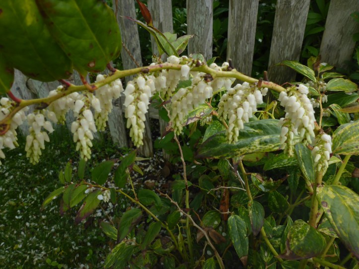 A few years ago during a visit to the Garden in the Woods plant shop, I indulged in a variegated doghobble (Leucothoe spp.) plant, and put it in a part-shade section of the front garden. It hasn’t thrived the way the leucothoe does at Garden in the Woods – it took a long time to establish and something seems to enjoy eating the leaves. But this year, for the first time, there was a noticeable flower on it. Very gratifying.