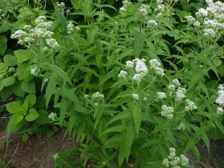 Boneset. This is a 3-foot perennial, boneset (Eupatorium perfoliatum), a relative of Joe-Pye weed and a Cape Cod native. The leaf has nice interest, the white flowers appear later in the season, and it is a pollinator magnet. (This picture was taken last summer.) After 3 years, there is only one other boneset plant in the garden bed, so it doesn’t seem to spread much at all.