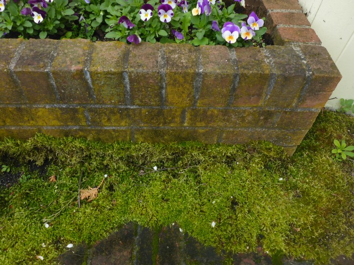 Moss. This grows on the brick around my front-door planter as well as in the lawn, both shady spots. The moss is especially welcome wherever the grass won’t grow thickly due to shade. I have even been known to transplant moss within the garden to fill in bare spots!