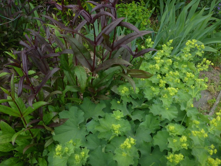 The Penstemon cultivar, with its dark purple foliage and white blossoms, is planted between two gold plants and provides great little vignettes of contrasting colors. The penstemon does self-seed, so I am trying to herd the seedlings to cluster around the yellow-foliage plants at that end of the garden, and weed them out elsewhere.