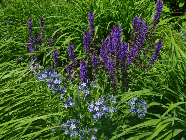 This is one of my all-time favorite combinations, with two different blue colors and two different flower shapes, in a sea of foliage. I had hoped they would bloom at the same time when I planted them, and it turned out perfectly.