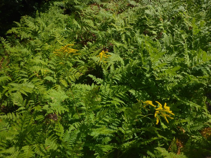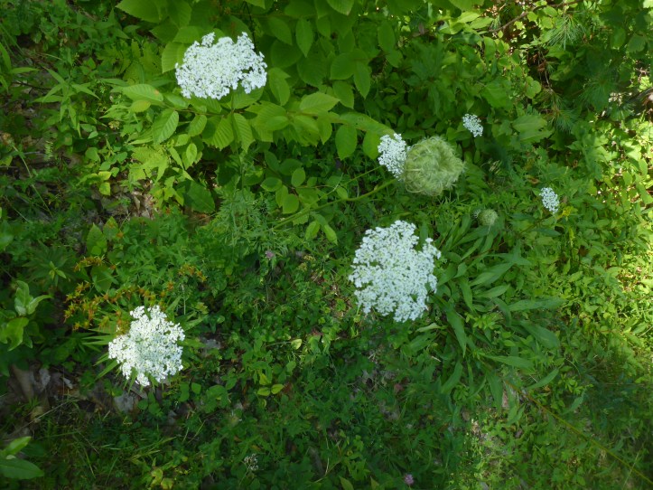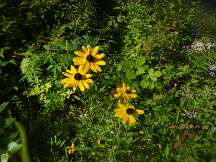 In this mid-August walk I saw many late-summer flowers in bloom. They were all in what I call the eye-catcher category, which is one or two plants blooming among foliage. Here are a few that caught my eye: fleabane, goldenrod, Queen Anne’s lace, and black-eyed Susan.
