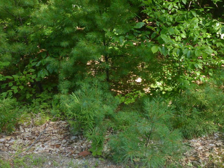 Several spots had multiple kinds of plants growing adjacent to each other, providing a nice set of mixed textures. The first one below is a mix of ferns, a young white pine, and sweet fern. The second is white pine with birch – I guess white pine goes with everything, right? As I do new plantings with shrubs and foliage predominating, these will be a great examples to remember.