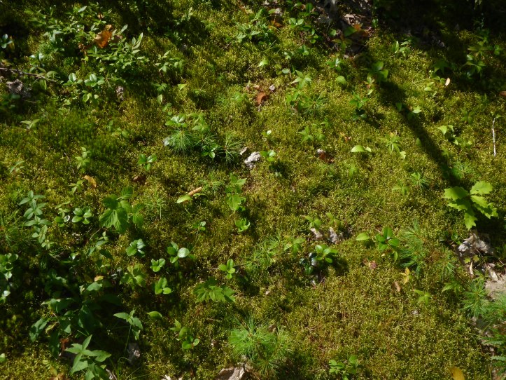 A common grouping I observed was a ground cover or two with a taller plant growing out and through the ground cover. They were all sizes – the lowest, shown below, started with moss as the ground cover, allowing wintergreens and other small plants to poke through.