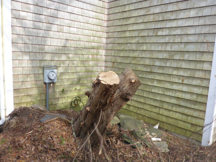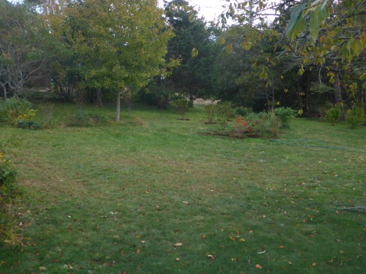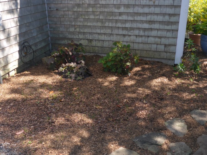 I considered a number of shrubs, such as Ninebark. Because this is Cape Cod after all, and because of the part shade conditions, I went with two oak-leafed hydrangeas. They should grow together over time to form a mass in front of the cedar shingles. Next spring, I will fill in the front part of this area with perennials and lower ground covers. That design will be a fun winter project.