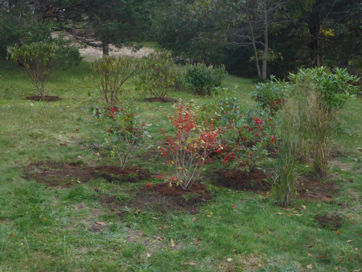 When I went plant shopping at the fall sales this year, I was in luck. I found three silky dogwoods (Swida amomum) and five dwarf winterberries (Ilex verticillata ‘Red Sprite’). They should all double in size over the next three years and fill out the design I have in mind.