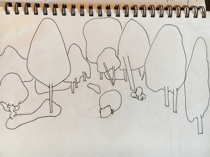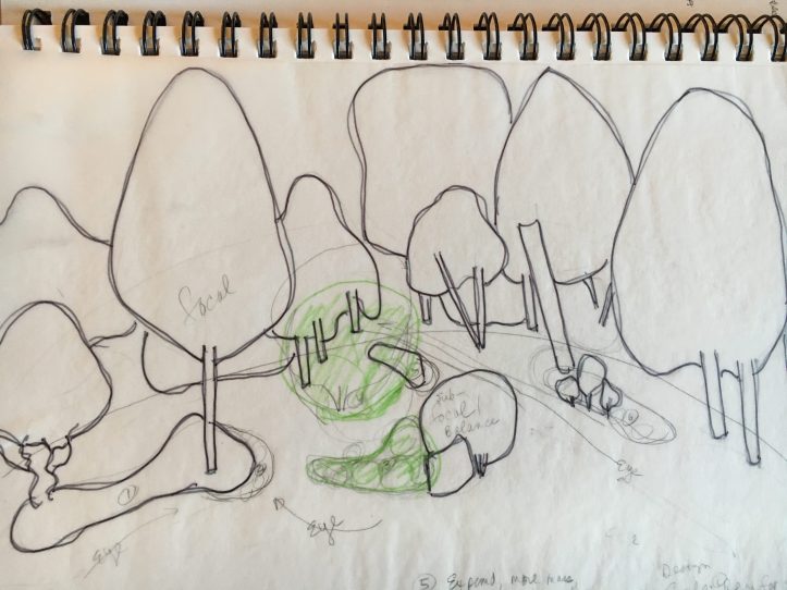 The way I approached it was to create a sketch of the major shapes from the patio, the vantage point I most frequently use. This always lets me look at a situation with a fresh eye; when I drew this the lovely seemingly circular sweep of the existing trees struck my eye. It was kind of obvious I didn’t want to disrupt that sweep.