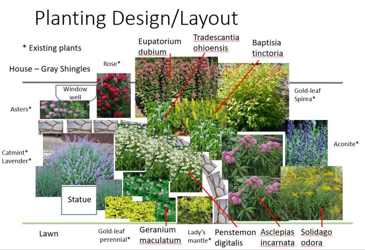 Another fun project was figuring out how to arrange these plants in the 8’ x 12’ space that I have, keeping in mind that I want to keep some of the existing plants. The result was a planting design that I really like, and that I think the pollinators will enjoy.