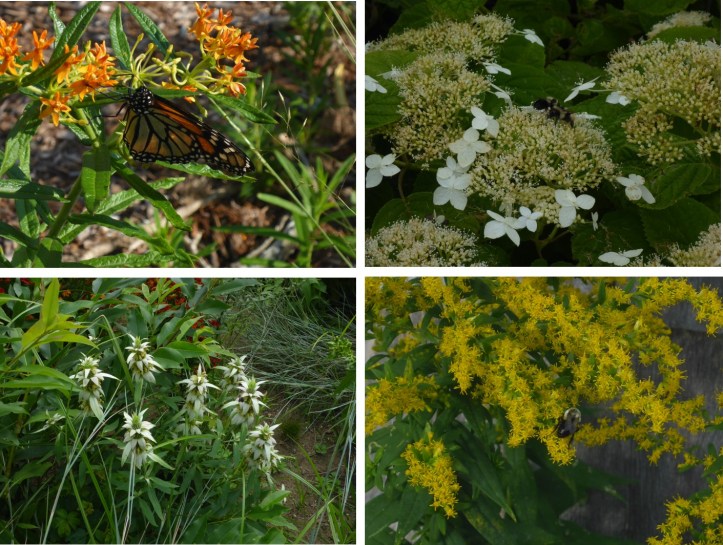 So when I began this journey to restore the ecological functions of our property, I didn’t study the pollinator issue deeply, I just assumed that if I planted a variety of native flora, the insects and pollinators would find food and homes, and all would be well. To some extent that has happened. There are many more flying creatures around all summer, and it is rare to visit the flowering borders and not see pollinators on the plants: