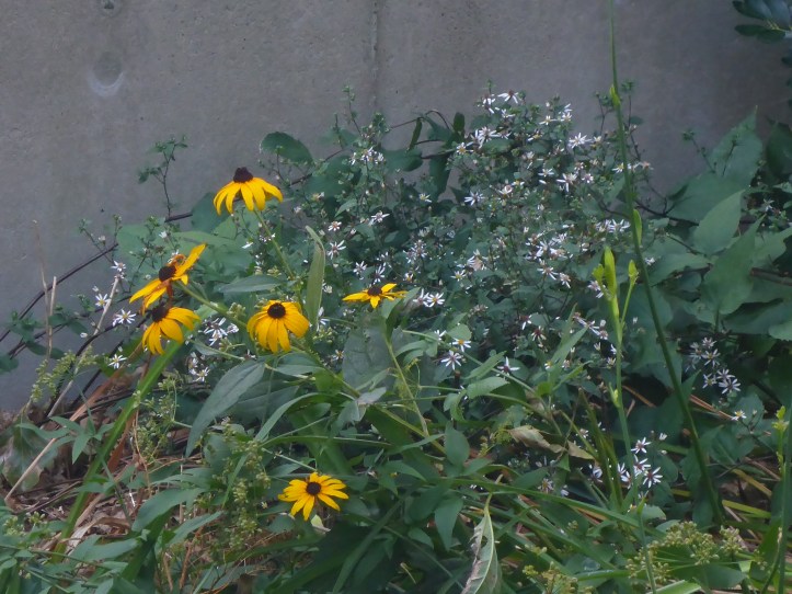 The Greenway is a long thin park in Boston with many different kinds of planting beds. In the picture below, taken in mid-August, the planting abuts a concrete barrier leading to a highway ramp. It is Black-eyed Susan (Rudbeckia sp.) and white wood aster (Eurybia divaricata). I like that both plants are both daisy-shaped, but have such different size, scale, and color.
