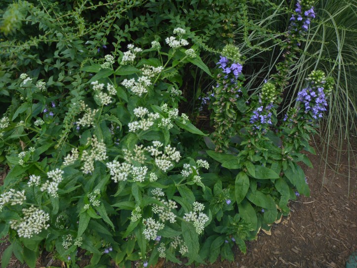 Here are two native plants of a similar size and similar leaves, but very different flowers. The white plant is boneset (Eupatorium perfoliatum) and the blue is great blue lobelia (Lobelia siphilitica). I have both of these plants in my gardens, but not together. An idea for next year, maybe?