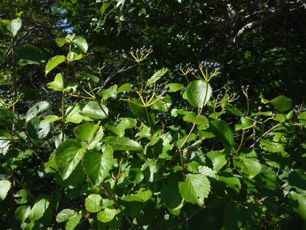 Arrowwood (Viburnum dentatum). A tall shrub of 10’-15’, arrowwood has many arching stems and noticeably toothed leaves. Flat-topped white flower clusters 4” wide attract pollinators, and birds seek out the blue-black fruits. This plant grows in both upland and damp soils, full sun or part shade, and in salty and windy conditions. Also a volunteer, this was one of the first native shrubs I identified in the yard, so I feel proud of myself whenever I look at it.