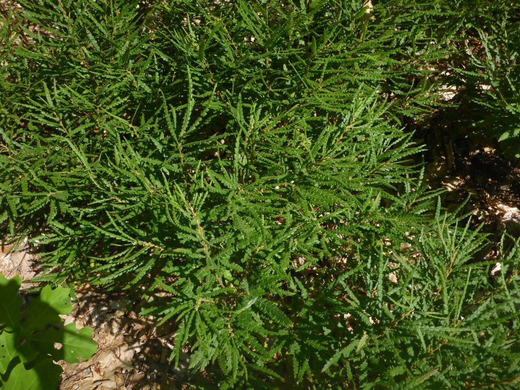 Sweet fern (Comptonia peregrinis). A low shrub of 2’-4’, this shrub resembles a fern because of its densely arranged, long, lobed leaves. It prefers full sun in upland soil or part shade on the edge of a woodland. This is a tough plant, both drought and salt tolerant, that will colonize over time. I have planted this is several locations, in groups of 2-3 plants, and find that the texture is more striking when it is in a larger grouping.