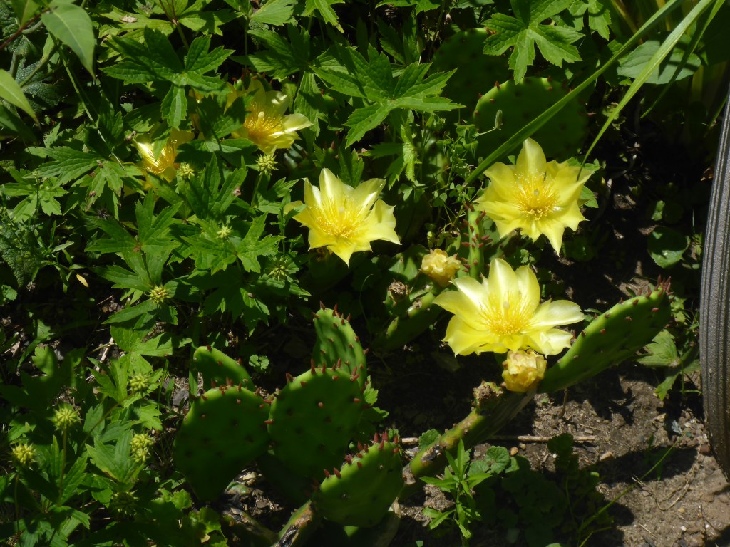 A lovely surprise on one of my garden walks: the Eastern prickly pear cactus (Opuntia humifusa) had bloomed for the first time ever.