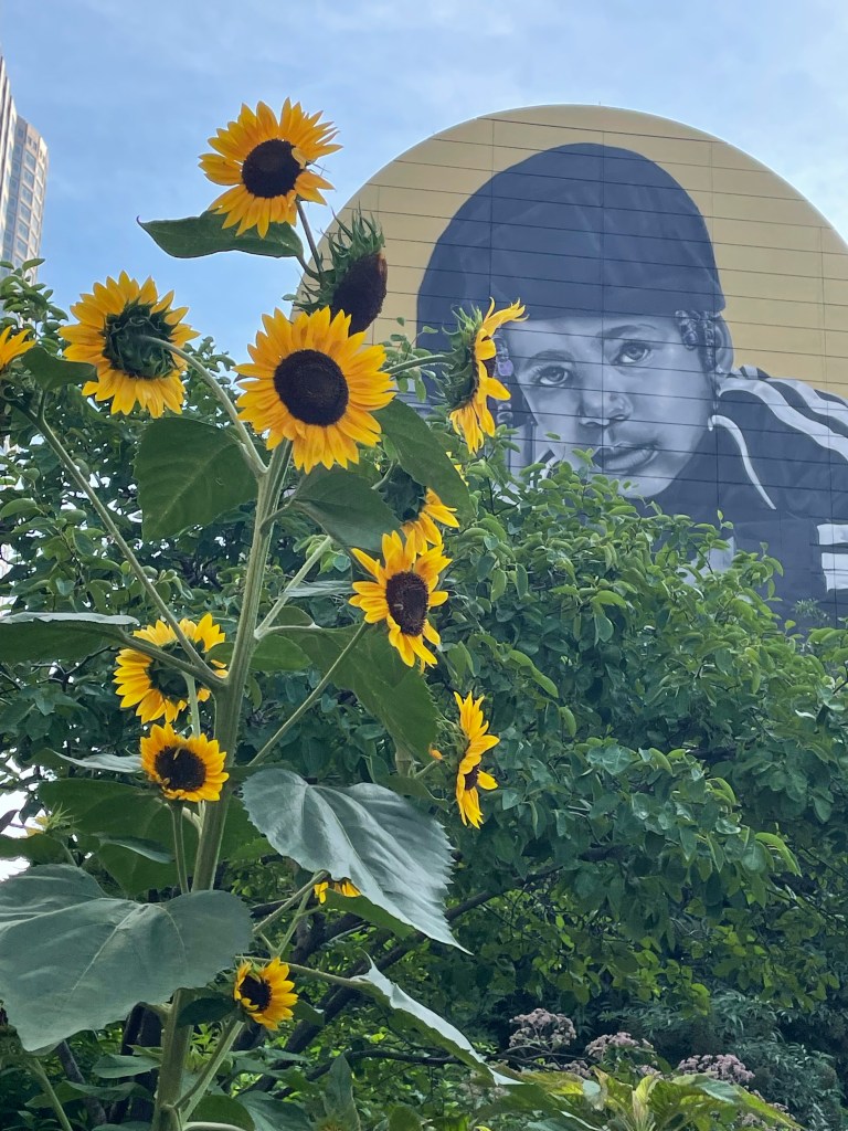 In early July we had a surprise project, which resulted from a collaboration of the Greenway Public Art and Horticulture groups with Ekua Holmes, who leads Roxbury Sunflower Project. The Sunflower Project itself is a wonderful story – Holmes started it by planting 20,000 sunflower seeds on unloved public land in Roxbury with a mission of spreading beauty and hope in this historically Black neighborhood. The project has grown each year as Holmes extends her message of resiliency and radiance. Last year, for instance, the Museum of Fine Arts invited her to plant sunflowers on the front lawn at the museum.