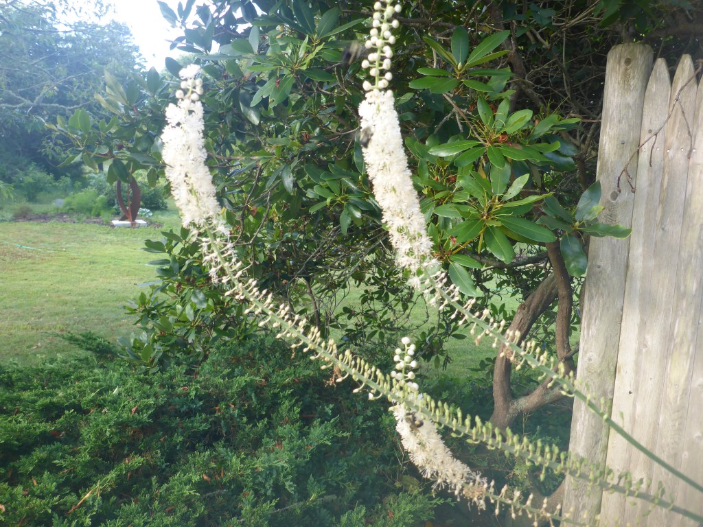 This is black cohosh (Actaea racemosa) which is planted next to our outdoor shower. It is covered with bees for about a month, but they never bother us while we use the shower. This vignette is a favorite. The white is narrow-leaf mountain mint (Pyncanthemum tenuifolia), the yellow is black-eyed Susan (Rudbeckia hirta), and the blue is downy skullcap (Scutellaria incana). This spreading perennial, broad-leaved mountain mint (Pycnanthemum muticum), seems to attract the smaller bees and other pollinators.Right in the center is a native bumblebee, exploring the blooms of the sweet pepperbush (Clethra alnifolia ‘Ruby Spice’). The clethras are one of the few shrubs that bloom in mid-summer. Another native bumblebee, this time on the anise hyssop (Agastache foeniculum ‘Blue Fortune’). This is actually not a native in New England, and it only lasts a few years in our poor soils, but I still include it in my garden, replacing it every few years as needed.And finally, this butterfly on the Joe Pye weed (Eutrochium dubium)!