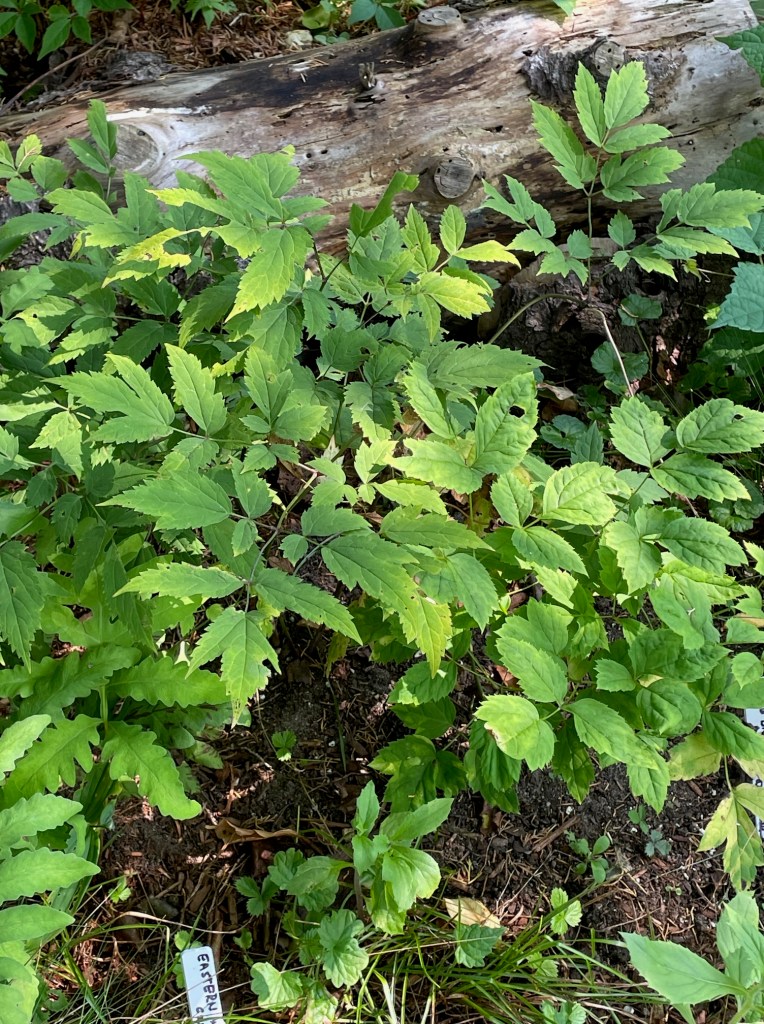 –The leaves are divided, almost fern-like but a bit larger, so they go well with ferns and sedges in a shady situation. They stay attractive throughout the summer.