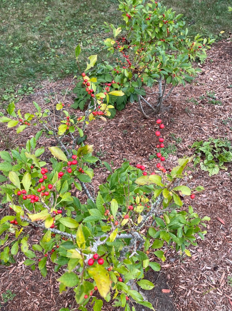 The winterberries (Ilex verticillata) flowered nicely and produced a good crop of fruit in their new garden. Last year I moved them from a spot that was too dry to a spot at the bottom of the slope, and they do seem to like it better. The leaves are yellowing already, perhaps a bit early due to the lack of rain.I love this mixed composition at the entrance to the woodland path. On the right are the shrubs ninebark (Physocarpus cultivar), fothergilla (Fotherfilla gardenii), and black huckleberry (Gaylussacia baccata), in the front the white wood aster (Eurybia divaricata) that has spread all over, more black huckleberry in the back, and the lady fern (Athyrium angustum) on the left, with wild strawberries (Fragaria virginiana) underneath.
