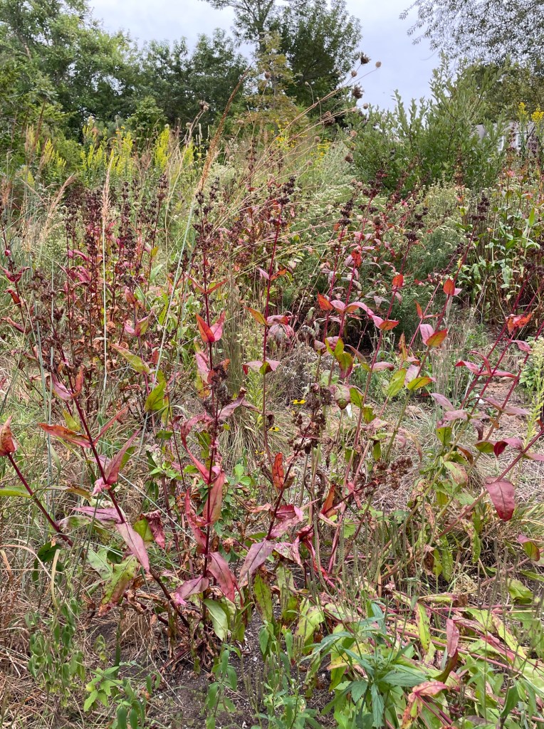 Most of the perennials just turned to yellow and brown, but the beardtongue (Penstemon digitalis) turned this lovely red-burgundy shade. This year I tried a new-to=me goldenrod in the meadow. I had tried it elsewhere, but the rabbits ate it. Here, this showy goldenrod (Solidago spectabilis) survived and in early September it put out these large (8″) clumps of the characteristic tiny daisy-like flowers. Like all the goldenrods, this one attracted a lot of native bees and other pollinatorsAnother rescue from the rabbits – I don’t know why I didn’t create a fenced-in place for perennials years ago! This is ironweed (Vernonia novaboracensis). When I transplanted it last summer, it was totally eaten down, so I was surprised and pleased when it came back this year. They grow 3-5′ high so it was easily visible among the other tall plants in the meadow.