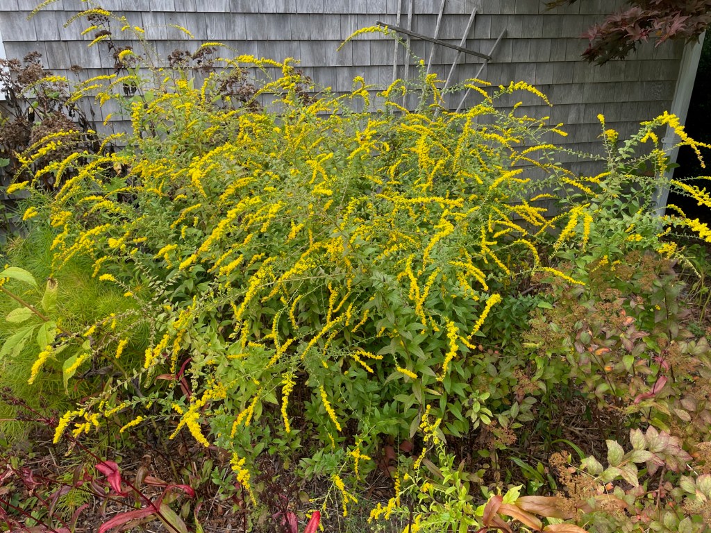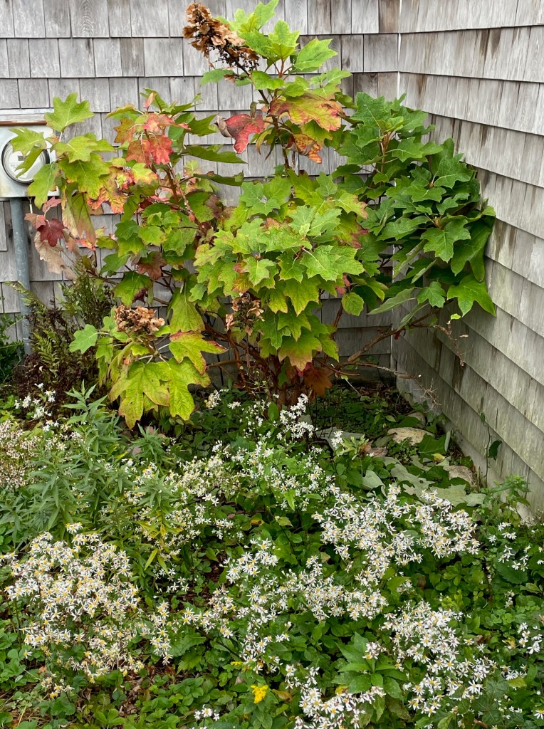 In the South Border, the great blue lobelia (Lobelia siphilitica) has bloomed continuously since the first of August. You can see from its long flower stems that it is just about done. At the bottom is a stand of bluestar (Amsonia tabernaemontana) which is turning to a lovely yellow.Still in the South Border, just to the left of the lobelia, the stand of prairie dropgrass (Sporobolus heterilepsis) did not disappoint. Behind them, the goldenrod is still going, and behind the goldenrod is the smooth hydrangea (Hydrangea arborescens) – this is the layered look I’ve been trying for in this section.In the little corner by the garage, the white wood aster (Eurybia divaricata) is blooming more prolifically than I expected, since this is now a full-sun garden. Above, the oak-leaf hydrangea (Hydrangea quercifolia) is just starting to turn, a bit late, but it will turn to dark-burgundy leaves that will last until Thanksgiving.Back in the Glory Garden, not much is in bloom except this terrific stand of goldenrod. It is a cultivar called Fireworks (Solidago rugosa ‘Fireworks’), which is readily available in nurseries. You can see from the bloom patterns how it earned that name. This goldenrod does spread a bit, but not nearly as much as the wild goldenrods.