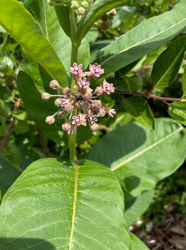 Another native plant just getting ready to bloom. This is the common milkweed (Asclepias syriaca) and the flower will very shortly be a pretty pink sphere of smaller blossoms. This is also a volunteer that I am allowing to reseed in the meadow. I haven’t seen any monarch butterflies yet, but will keep looking.I know this isn’t the most glorious picture, but I wanted to show that finally the grass layer in the meadow is taking hold. Most of those grasses are little bluestem (Schizachyrium scoparium) and the end goal for this section of the meadow is to have lots of perennials rising up above a pretty dense but lower grass layer. The single stems seen here are a combination of blue vervain (Verbena hastata) which is starting to bloom now, and bee balm (Monarda fistulosa) which will bloom later.And last but not least, beautiful plant combinations in the meadow are starting to be seen. The orange is butterfly milkweed (Asclepias tuberosa), the purple is blue vervain (Verbena hastata) and the while is slender mountain mint (Pycnanthemum tenuifolia). Because several of these plants are short-lived but seed around, the combinations differ every year, and it’s fun to capture these ever-changing scenes.