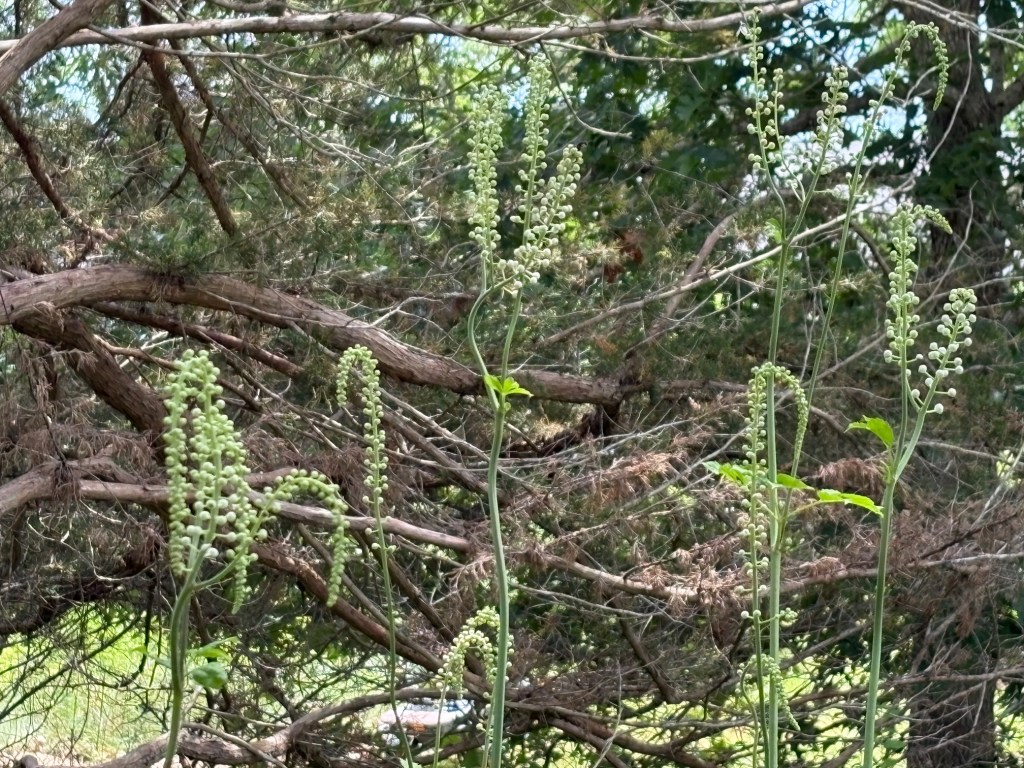 There is a section of the woods that I have not touched at all. It has a wild cherry, some cedars, a pitch pine, and an old arborvitae as trees. The ground layer is mostly wild blackberries, which I will have removed and replanted with a better shrub layer later. But three years ago, this volunteer started up. It is a purple flowering raspberry (Rubus odoratus), a native plant that is as large as a shrub but dies back to the ground each year. It flowers later than other raspberries and blackberries, has no thorns, and produces edible fruit that I let the birds eat. It is kind of thrilling to have a valuable native plant just show up and thrive!The black cohosh (Actaea racemosa) is just getting ready to flower. I have said this is one of my favorite perennials, and it seems it is a favorite of all the native bees in the neighborhood, too. The flowers will last through the end of July.