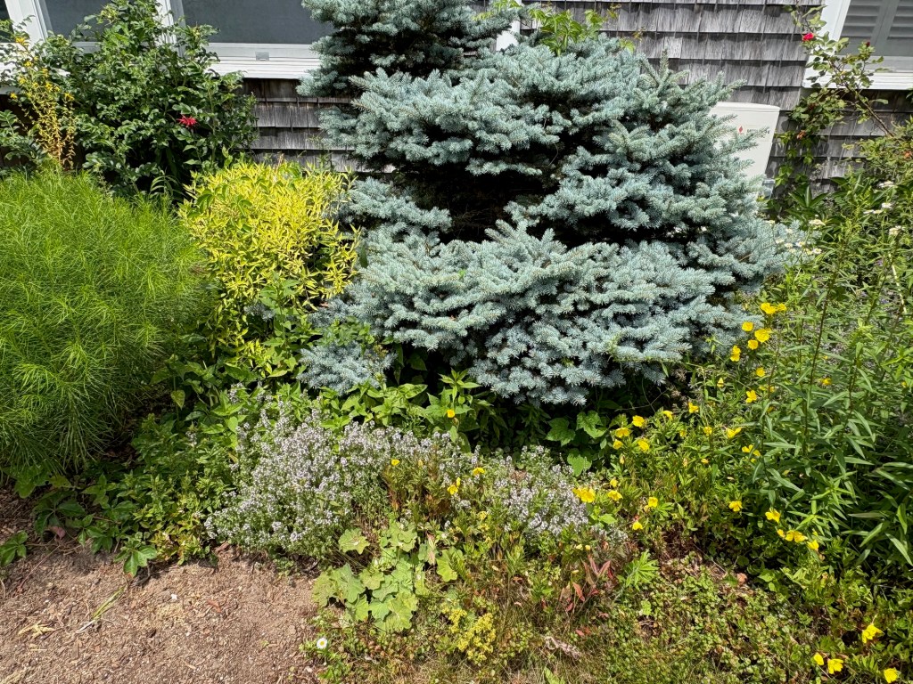I am still enamored of my blue and yellow combinations, especially with lots of interesting textures. This is a mix that I started well before my native plant journey, but the addition of some native plants makes it even better. The shrub in the center is a dwarf blue Norway spruce, and next to it is a golden caryopteris, non-native but still loved by pollinators.to the left is an amsonia, its blue blossoms already done, and below them in light blue is golden thyme. The yellow flowers in the lower right are a cultivar of the native sundrops (Oenothera). The bare ground is where I just dug up some daffodils. I’m looking for a new front-row plant to put there.The garden bed that anchors the statue is coming along nicely. The prairie dropseed around the base is almost at its full size and is making a lovely contrast to the steel and concrete base. Behind that is an area of golden alexander (Zizia aurea) that has finished, and the potentilla shrubs in the far back are just starting up.