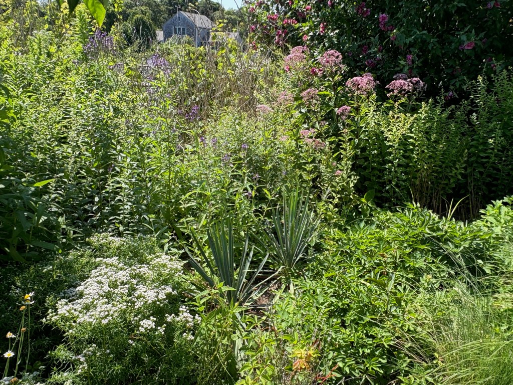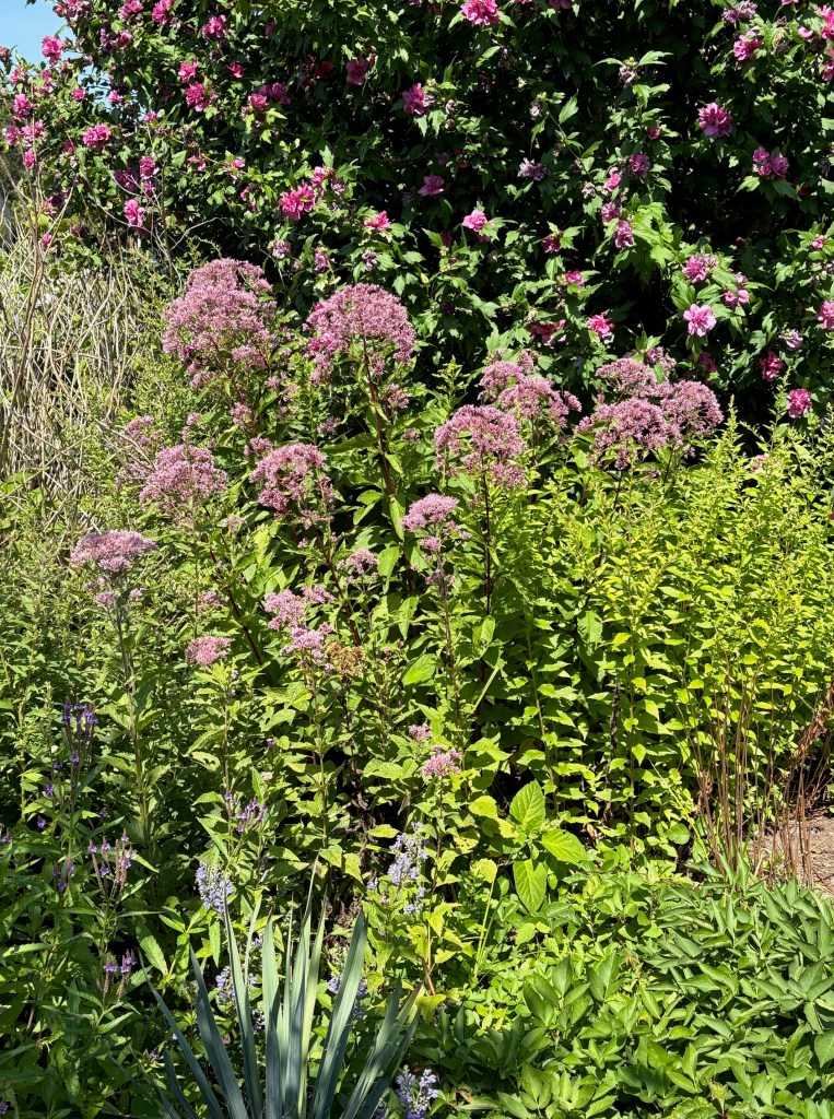 And finally in August, everything came together. All the pinkish purple things bloomed at once, with several white blooms surrounding them. It’s not an award-winning composition, but it suits the place and it suits me.