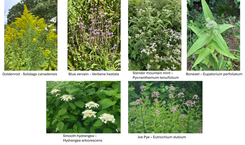 The space in question is along the southern edge of our property, about 100 feet long, in front of a split-rail fence and on the other side of our septic field. The border is about 15 feet deep, and much of it is planted in large shrubs and small trees – rose of Sharon, a crabapple, and blue hydrangeas from the pre-native plant era, and smooth hydrangeas, a half-native dogwood and a large stand of sweet pepperbush that is rapidly colonizing. There are two spaces in the border that I had set aside for perennials, both for color and interest and for pollinators.