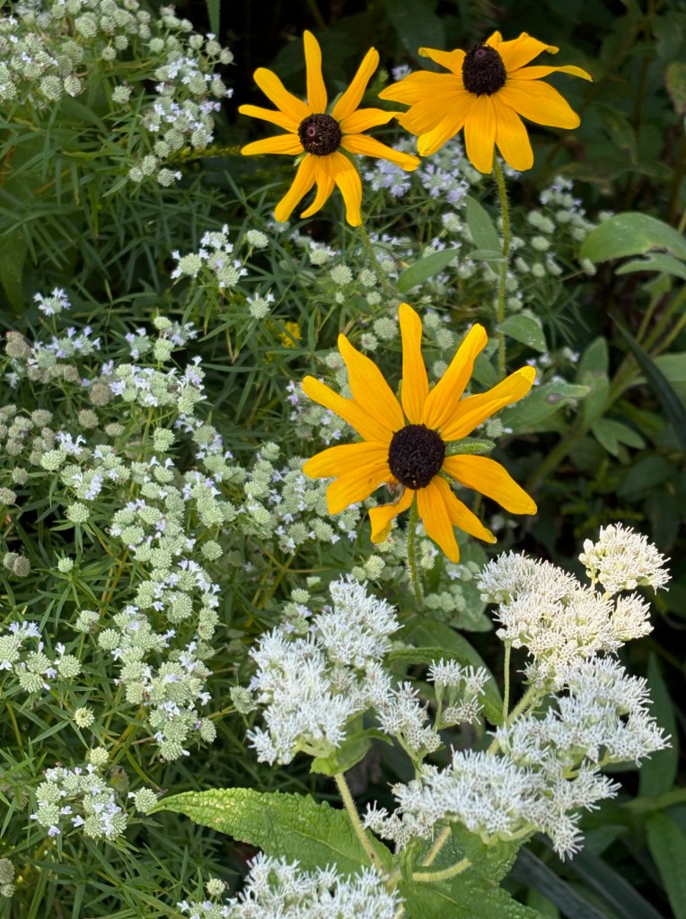 Another photo from the South Border, this one shows on the left narrow leaf mountain mint (Pycnanthemum tenuifolium) and on the right boneset (Eupatorium perfoliatum), which bloom reliably in the late summer. The black-eyed Susan (Rudbeckia hirta), growing up through them, is a short-lived perennial that self-seeds, so I never know where it will be coming up. This year I was lucky that it grew through another plant, as the rabbits usually enjoy these before I get to see them flower.