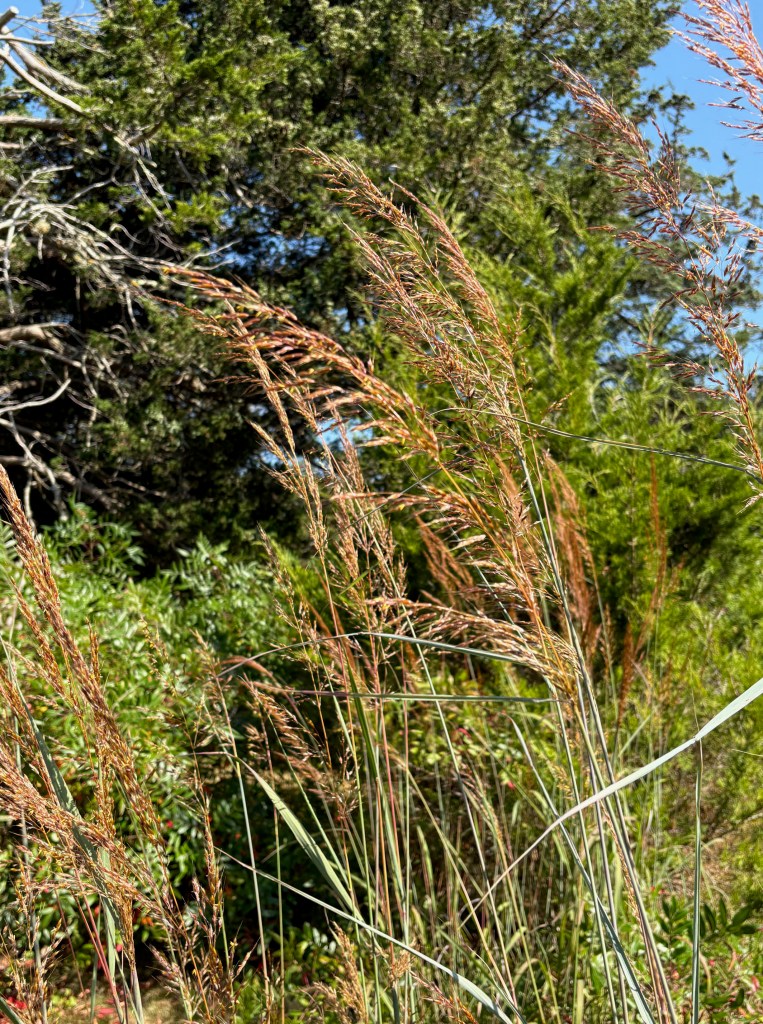 Also near the meadow is this Indian grass (Sorghastrum nutans). I planted a few of these in the meadow itself, but it didn’t come back the second year. Instead, a half-dozen of them seeded around the outside of the meadow under the cedars where it doesn’t get mowed.