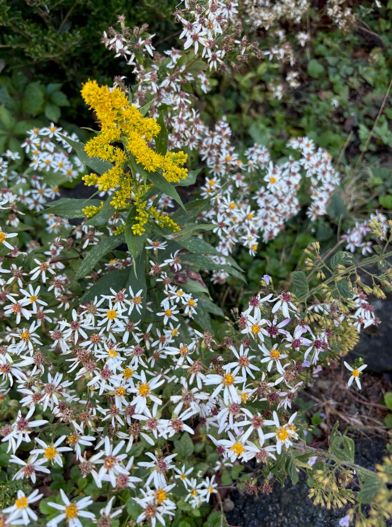 Finally, more asters and goldenrod, the duo that marks the fall. This is white wood aster (Eurybia divaricata), which grows low and prefers part shade. It is a great plant for a ground cover, as it spreads easily. With it is Canada goldenrod (Solidago canadensis). Usually I pull it out of this particular bed as an aggressive weed, but I missed one, so I get to enjoy this lovely fall combination.